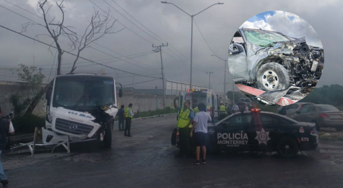 La mañana del sábado se registró un accidente en la colonia Paseo de San Bernabé, al norte de Monterrey, Nuevo León. Un transporte de personal y una camioneta Pick-Up colisionaron en la intersección de la calle Del Palmar con la calle 12 de Agosto, lo que dejó varias personas lesionadas y generó complicaciones viales en la zona.