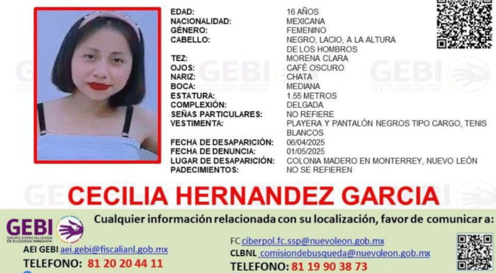 La familia de Cecilia Hernández, una adolescente de 16 años originaria de Monterrey, continúa su búsqueda luego de que desapareciera tras encontrarse con un joven que conoció a través de la red social Facebook. La joven fue vista por última vez en su domicilio ubicado en la colonia Francisco I. Madero, cuando salió acompañada de un joven identificado solo como Carlos, de 19 años.