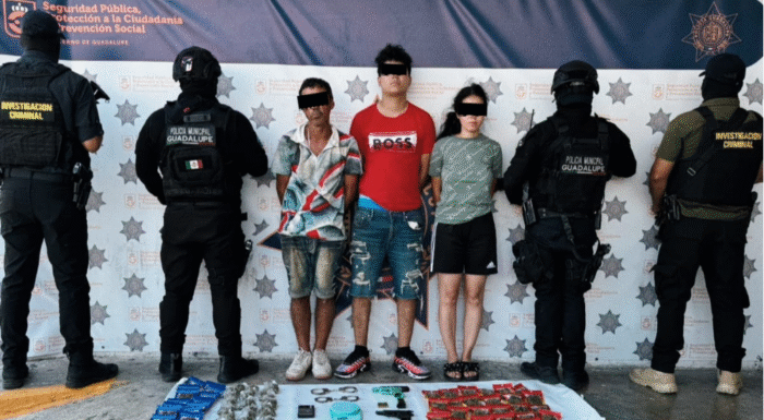 En un despliegue de seguridad realizado en la colonia Valle Soleado de Guadalupe, Nuevo León, elementos policiacos detuvieron a tres presuntos integrantes de una organización delictiva. Durante la intervención se aseguraron más de un centenar de dosis de sustancias ilegales, armas de fuego y una suma importante de dinero en efectivo.